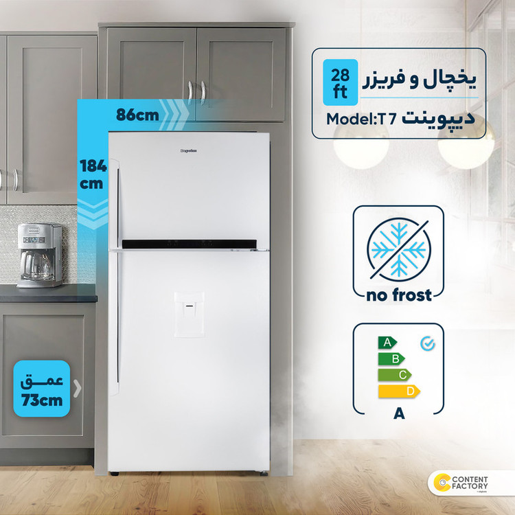 یخچال و فریزر 28 فوت دیپوینت مدل T7، بدون برفک، با ارتفاع 184، پهنای 86 و عمق 73 سانتیمتر، میزان مصرف انرژی A، دارای 4 طبقه در یخچال و 2 طبقه در فریزر، دارای سیستم نوفراست