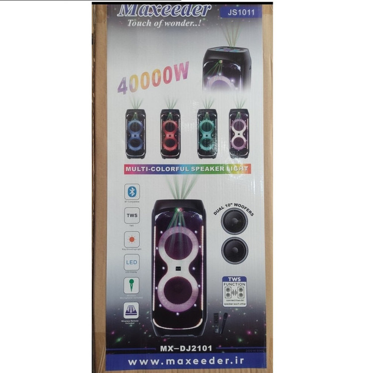اسپیکر مکسیدر JS1011 محصولی بسیار با کیفیت بالا و طراحی عالی از برند مکسیدر است که رضایت و توجه بسیاری از خریداران و مشتریان را به خود جلب کرده است. باند موجود در اسپیکر مکسیدر JS1011 دارای رقص نور بسیار زیبایی می باشد و در هنگام تاریکی شب، جذابیت محیط اطراف را چند برابر و لحظات شما را مفرح تر می کند.این اسپیکر با 2 عدد ساب ووفر 10 اینچی و 2 تیوتر صدایی فوق العاده ایجاد می کند. وجود تیوتر های تعبیه شده در این پخش کننده خانگی مکسیدر پخش صدای ریز را به عهده دارد و و موزیک و صدای پخش شده از دستگاه را با طنین و وضوح بالایی پخش می کند. همچنین امکان پخش موسیقی با فرمت های mp3، wav و wma و همچنین تنظیم بیس و تریبل نیز از دیگر امکانات آن است.