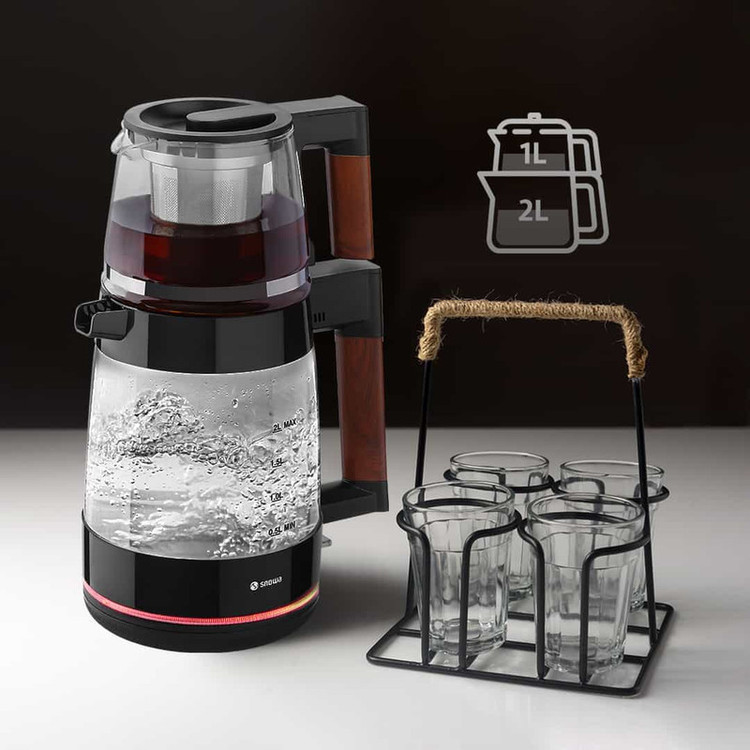 چای ساز اسنوا مدل STM-GS1650WE از نوع سرهمی است که توان بالایی برای آماده کردن چای و انواع دمنوش دارد. با فشردن یک کلید، آب در زمانی بسیار کمی به جوش میآید. چای از طریق بخار آب کتری دم میشود که عطر و طعم آن را به خوبی حفظ میکند. چای ساز اسنوا به سیستم گرم نگهدارنده آب مجهز شده تا امکان استفاده از آب جوش وجود داشته باشد. همچنین، صفحه کتری به صورت متحرک 360 درجه طراحی شده که کار با دستگاه را آسان کرده است. مدل STM-GS1650WE از توان مصرفی 1800 وات بهره میبرد. این ویژگی باعث شده چای ساز اسنوا از قدرت مناسبی برای آماده کردن انواع نوشیدنی گرم برخوردار باشد. جنس قوری از شیشه است که گنجایش 1 لیتری دارد. جنس کتری نیز از شیشه و دستگیره طرح چوب بوده که ظرفیت آن 2 لیتر است. چای ساز اسنوا دارای نشانگر میزان آب کتری است که برای سنجش مقدار باقیمانده آب جوش کاربرد دارد. در مجموع، این محصول گزینه مناسبی برای افراد علاقهمند به چای و دمنوش محسوب میشود.